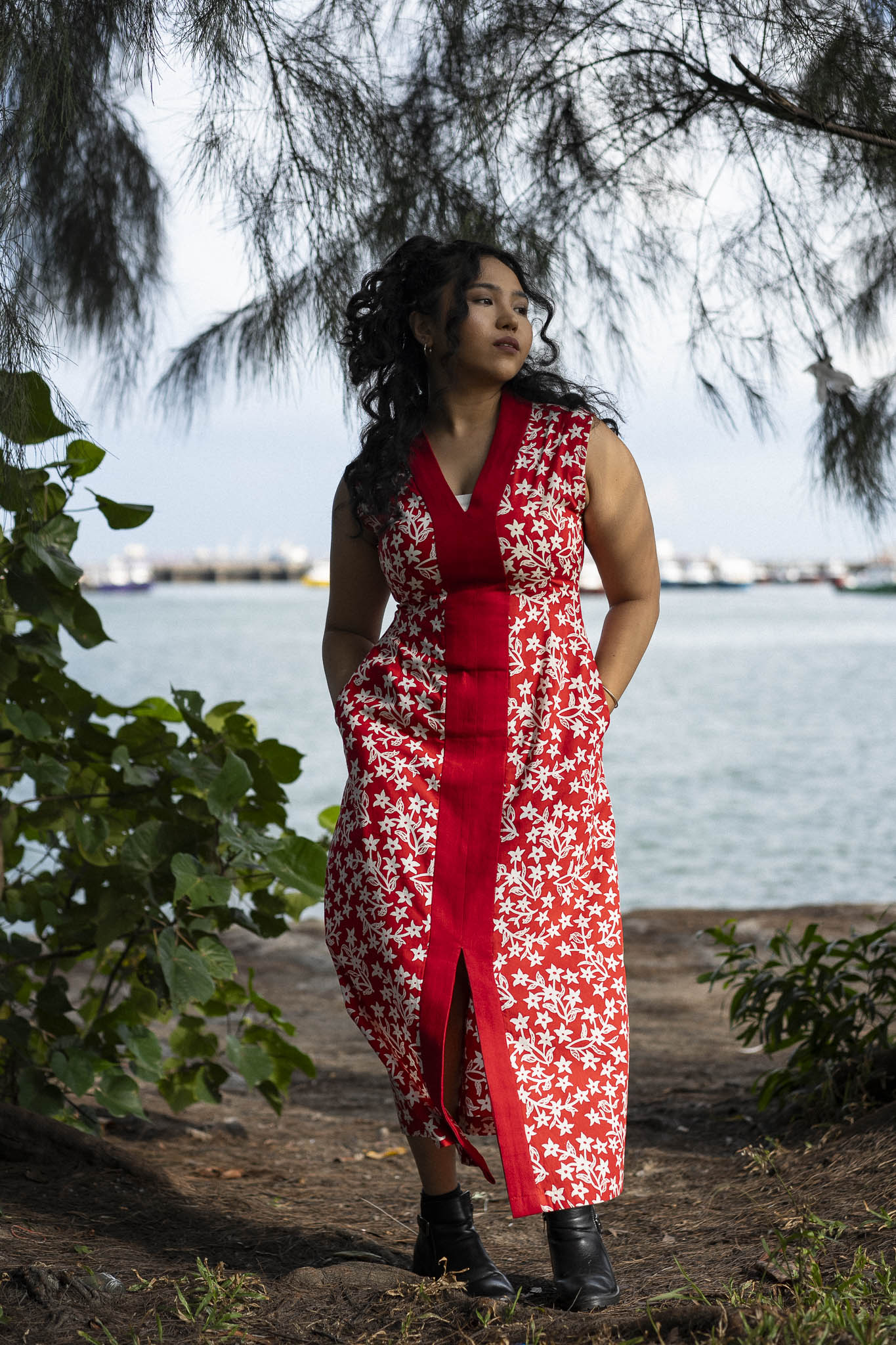 This midi dress is a nod to the kebaya panjang with its high lapel collar and long line silhouette. Designed tunic length, with knee high slits for ease of movement.